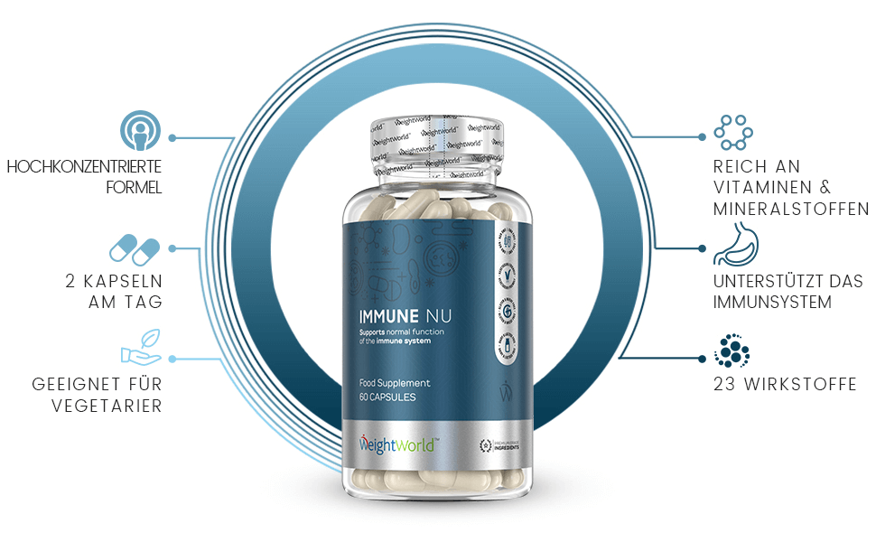 Immune NU wurde entwickelt, um das Immunsystem zu unterstützen und die Abwehrkräfte zu stärken. Die Kapseln bestehen aus verschiedenen Zutaten, die spezielle wegen Ihren schützenden Eigenschaften ausgewählt wurden, darunter befinden sich unteranderem Pflanzenextrakte, Vitamine und Mineralien. Es kann Ihren Körper in den kalten Jahreszeiten aber auch das ganze Jahr über beim Kampf gegen Krankheitserreger unterstützen. Zusätzlich zu einer gesunden und ausgewogenen Ernährung kann ImmuneNu dabei helfen gesund zu bleiben.