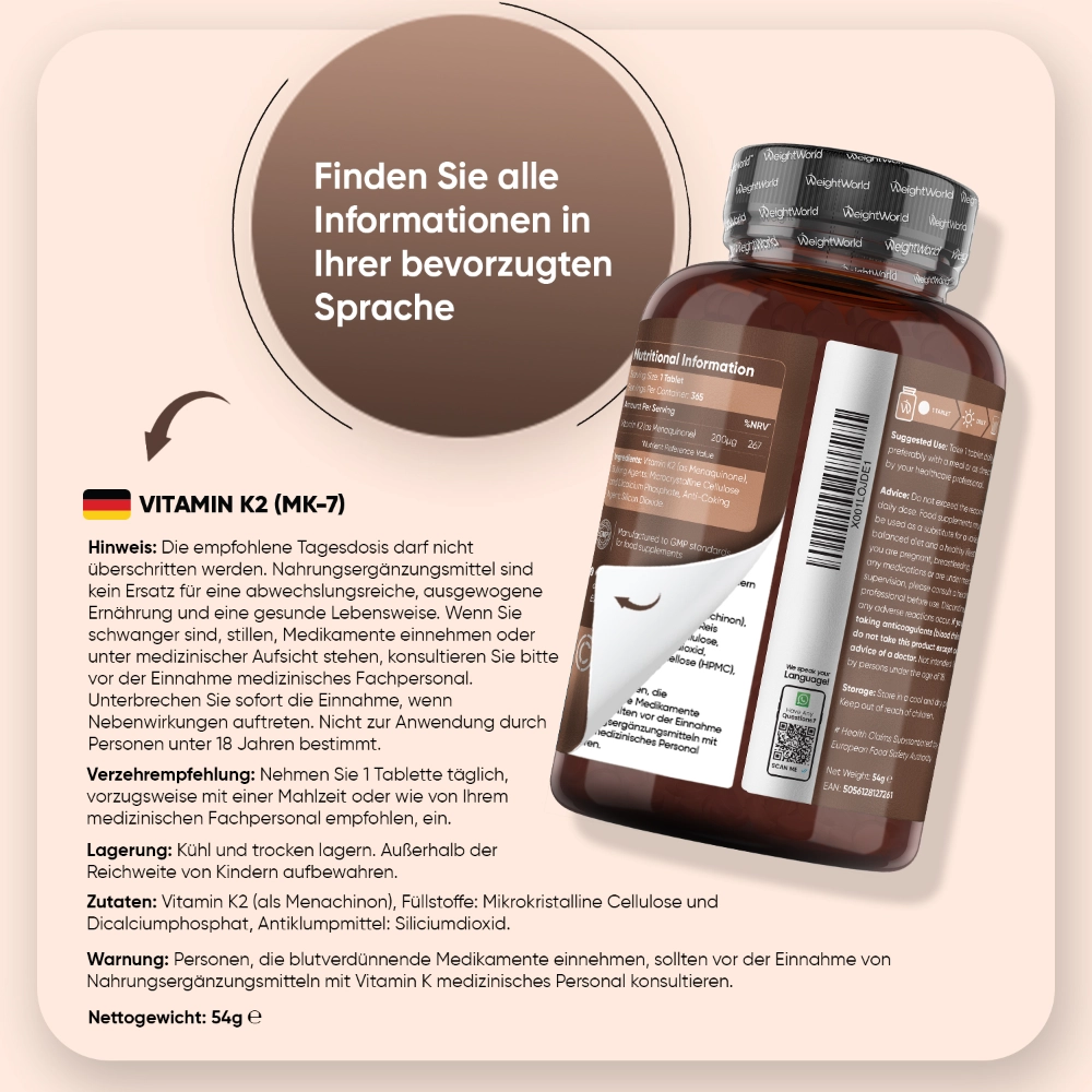 Warnung: Personen, die blutverdünnende Medikamente einnehmen, sollten vor der Einnahme von Nahrungsergänzungsmitteln mit Vitamin K medizinisches Personal konsultieren.