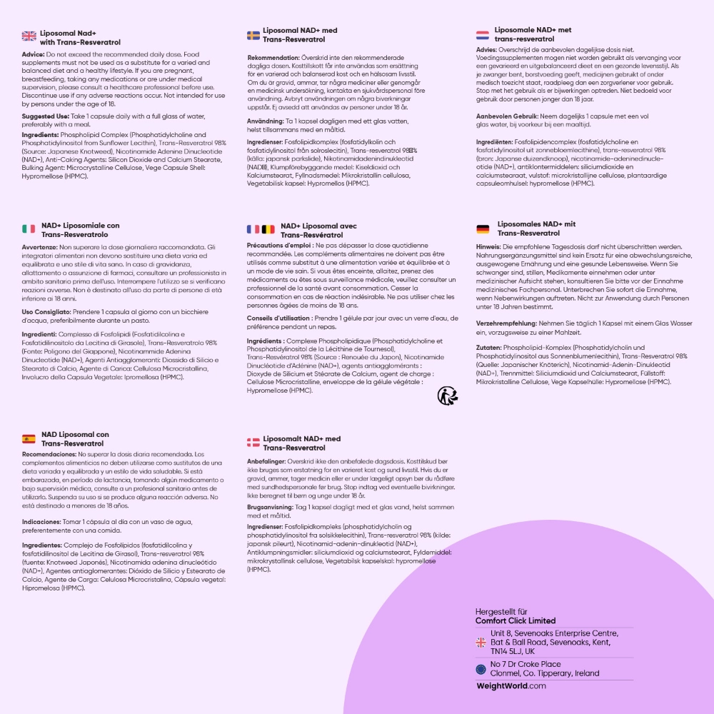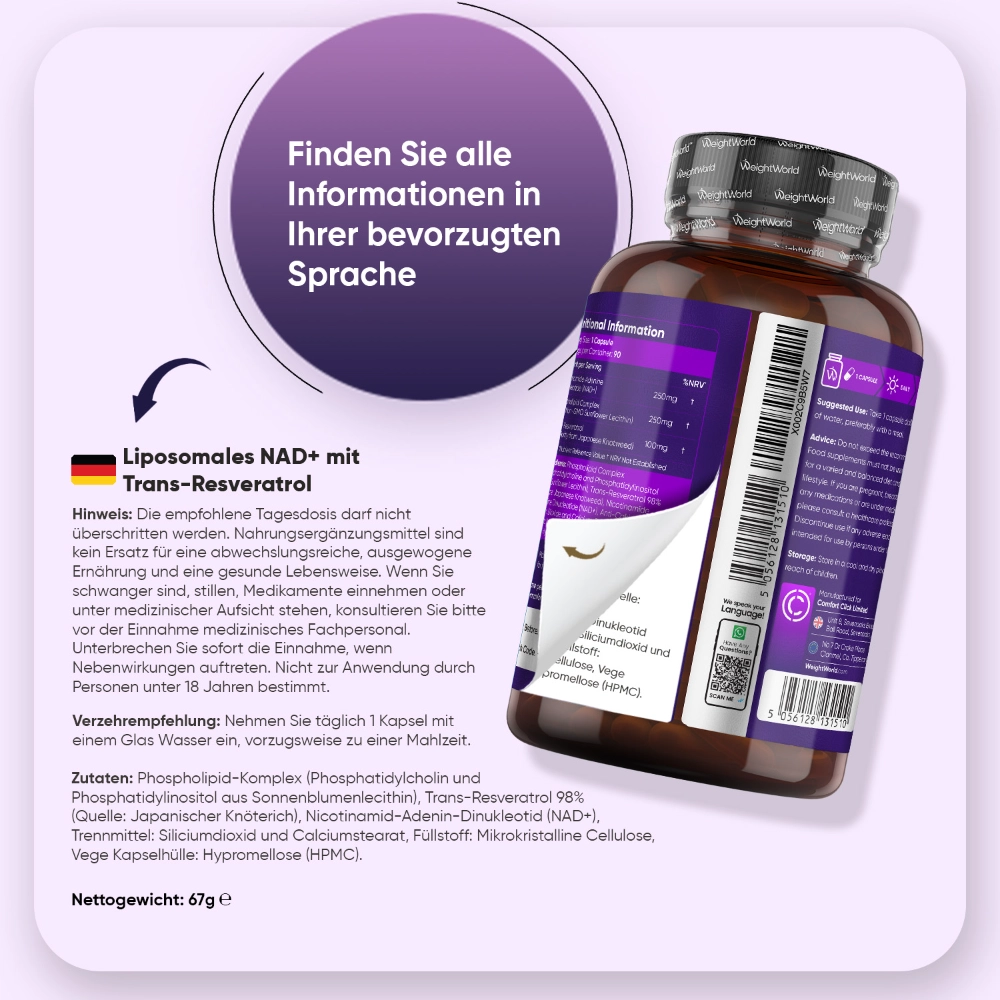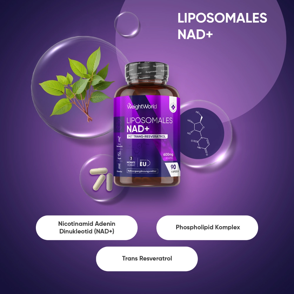 - 600 mg pro Kapsel mit hochwertiger, liposomaler NAD+ und Trans-Resveratrol-Formel.