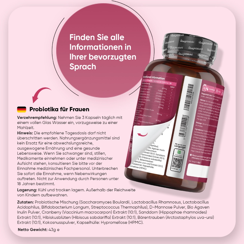 Die Probiotika für Frauen von WeightWorld vereinen 30 Milliarden KBE aus 6 ausgewählten Bakterienstämmen mit wertvollen pflanzlichen Inhaltsstoffen. Diese Rezeptur wurde speziell auf die Bedürfnisse von Frauen abgestimmt.