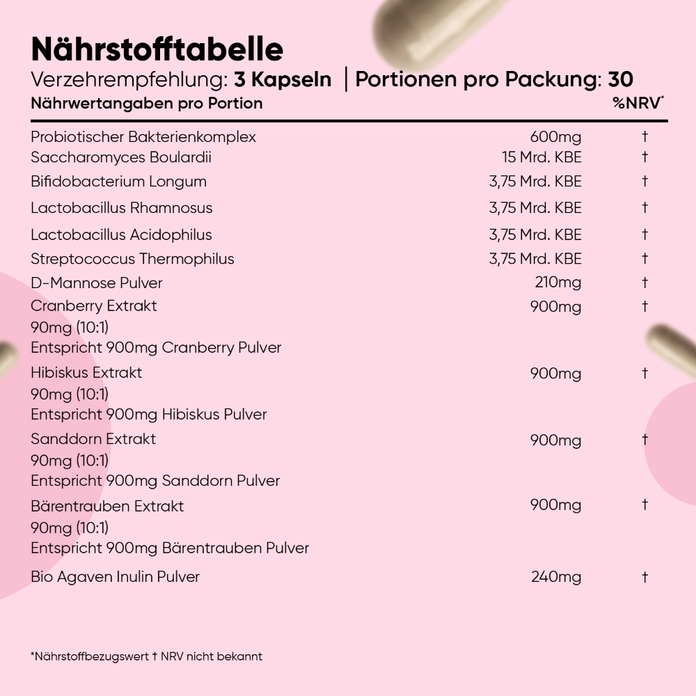 - Premium-Zutaten: 30 Milliarden KBE aus 6 ausgewählten probiotischen Stämmen, ergänzt mit D-Mannose, Cranberry, Hibiskus & Sanddorn.