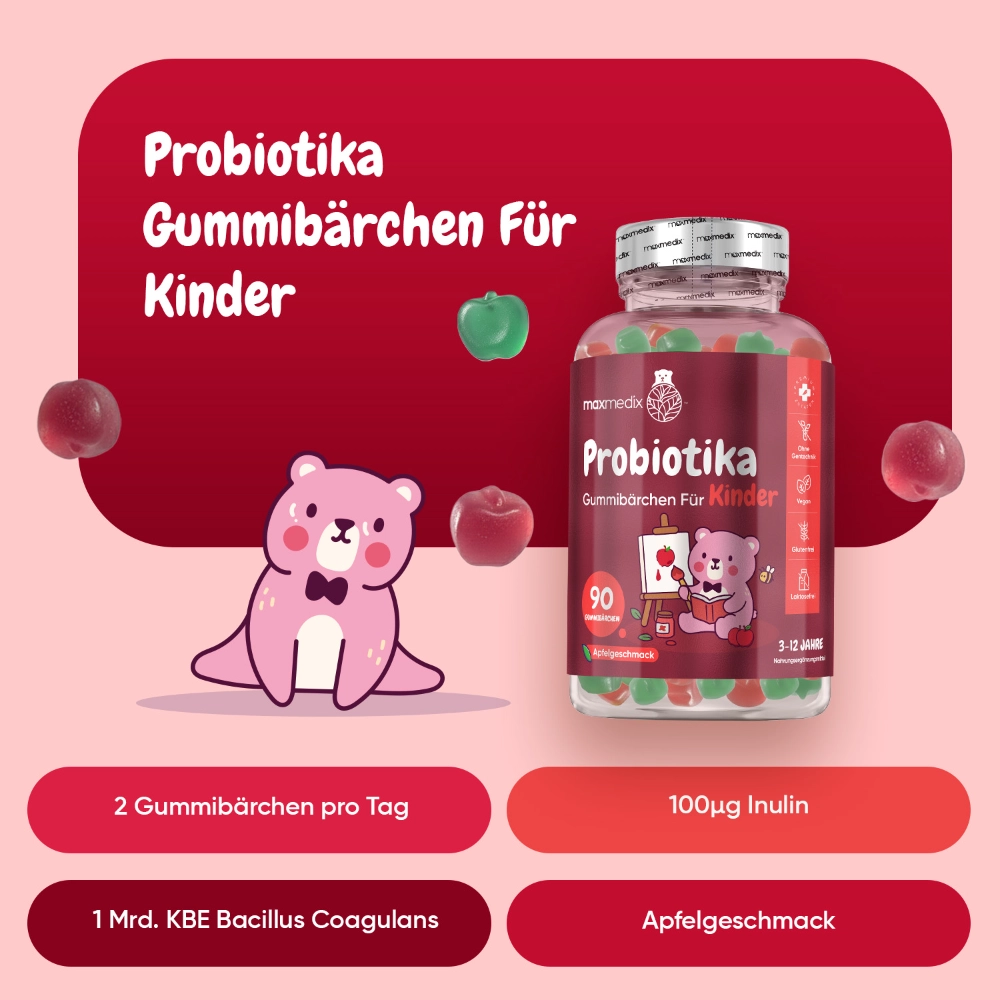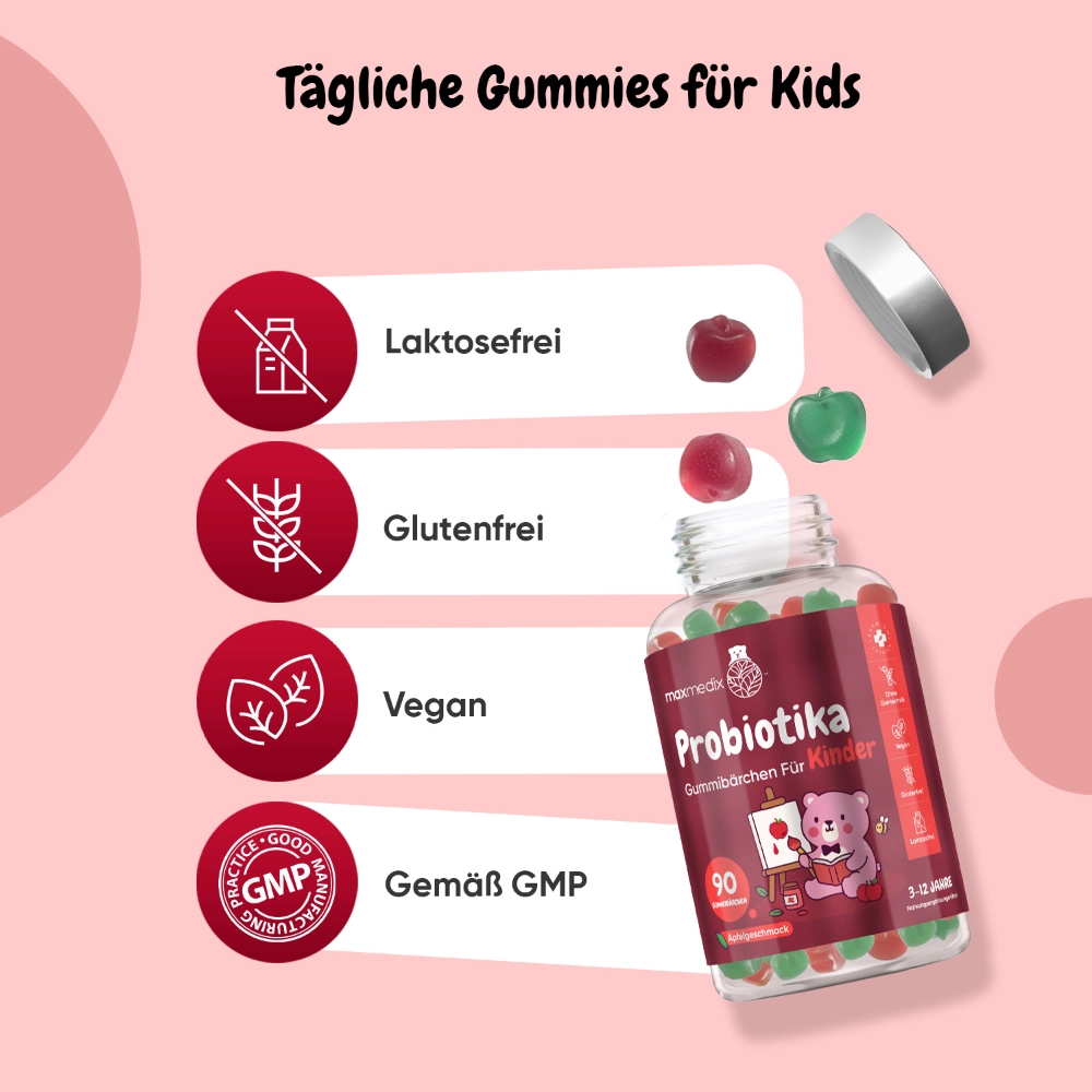 Die Rezeptur von unseren Maxmedix Probiotika Gummibärchen wurde speziell für junge Altersgruppen entwickelt und kombiniert den probiotischen Stamm Bacillus coagulans mit dem prebiotischen Ballaststoff Inulin. Sie wurden speziell für Kinder im Alter von 3 bis 12 Jahren entwickelt und überzeugen durch ihre weiche Gummibärchen-Form mit angenehmem Apfelgeschmack. Die Rezeptur ist vegan sowie gluten- und laktosefrei und eignet sich damit für unterschiedliche Ernährungsbedürfnisse. Mit 90 Gummibärchen pro Packung ermöglichen sie eine einfache Portionierung und lassen sich mühelos in den täglichen Kinderalltag integrieren. Maxmedix steht dabei für sorgfältig ausgewählte Inhaltsstoffe und eine kinderfreundliche Produktgestaltung.