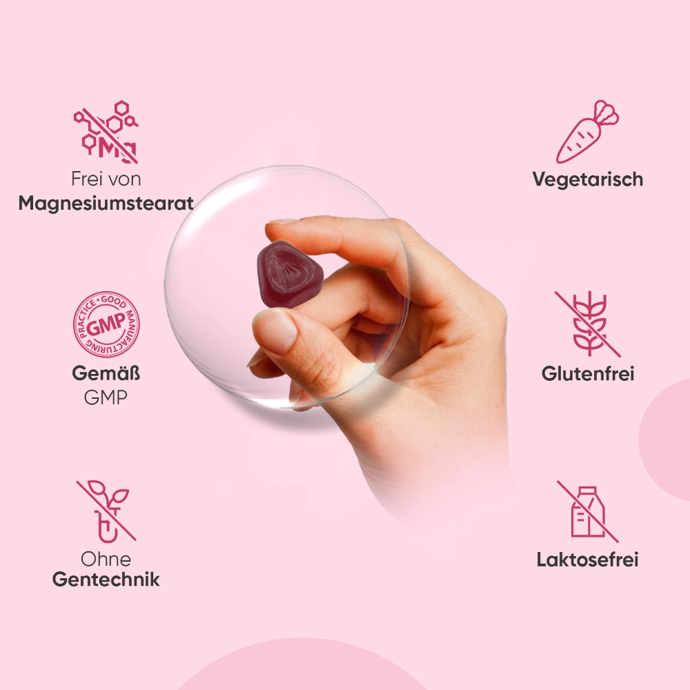 - Frauen, die Kapseln vermeiden möchten: Die angenehme Gummiform bietet eine leckere Alternative zu Tabletten oder Pulvern.