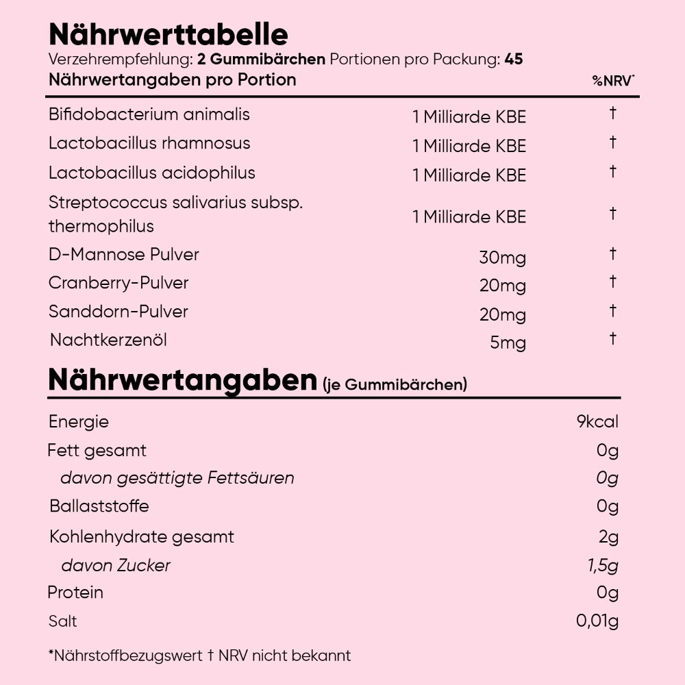 Die Rezeptur vereint verschiedene probiotische Kulturen wie Bifidobacterium animalis, Lactobacillus rhamnosus, Lactobacillus acidophilus und Streptococcus salivarius subsp. thermophilus mit ergänzenden pflanzlichen Inhaltsstoffen wie D-Mannose, Cranberry- und Sanddorn-Pulver sowie Nachtkerzenöl.