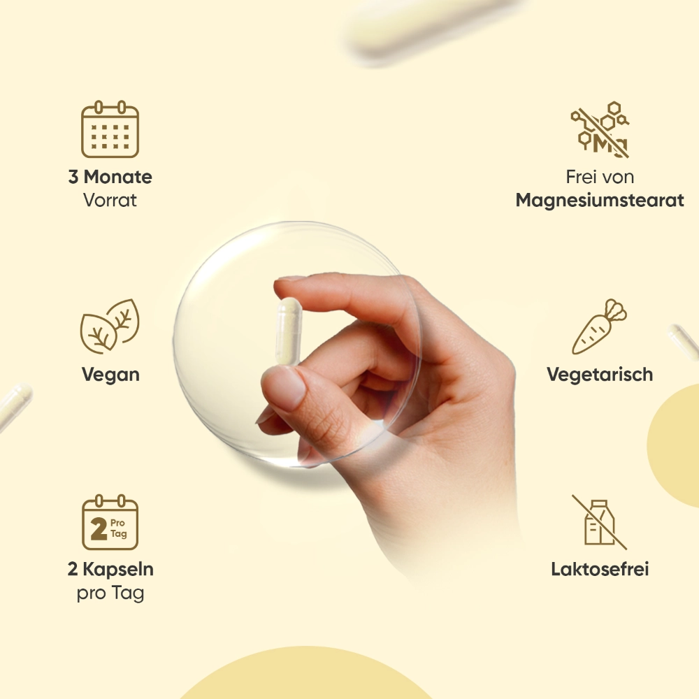- Leicht einzunehmen: Kapseln bieten eine bequeme und einfache Möglichkeit zur täglichen Einnahme.