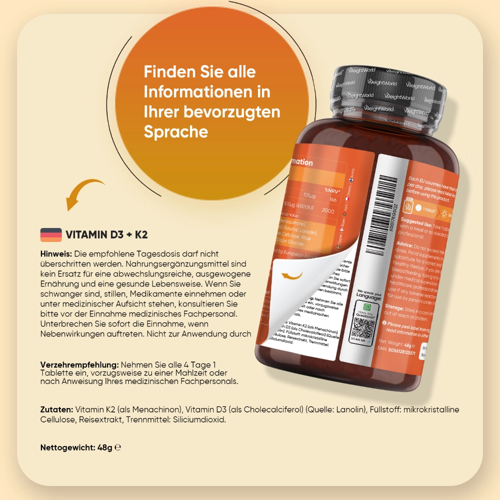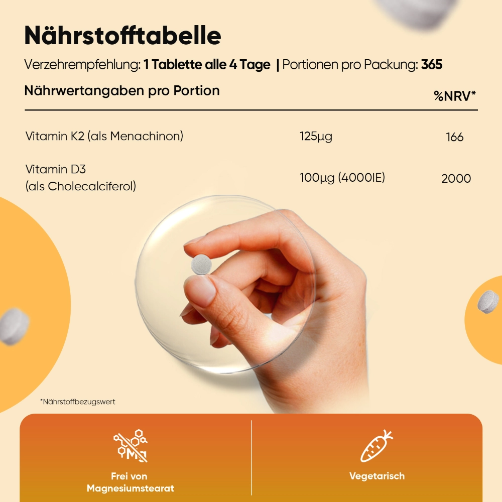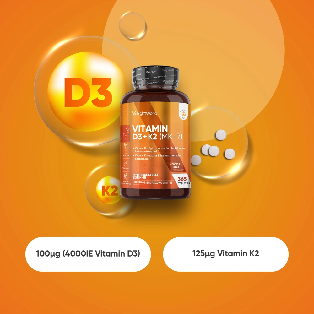 - Unterstützt starke Knochen und Zähne – mit Vitamin D3 K2 Tabletten fühlen Sie sich jeden Tag aktiv und beweglich.